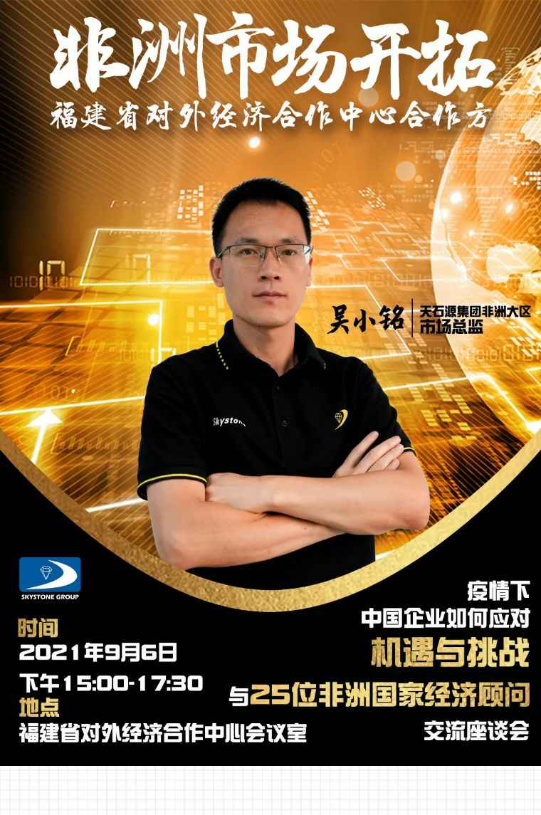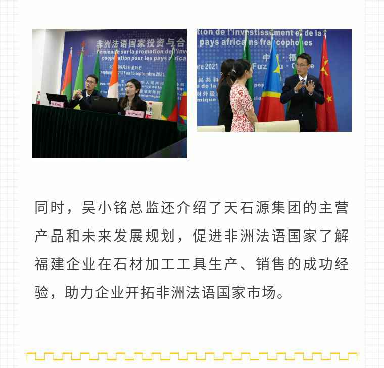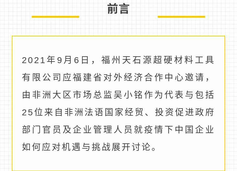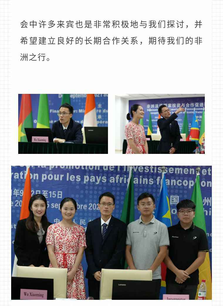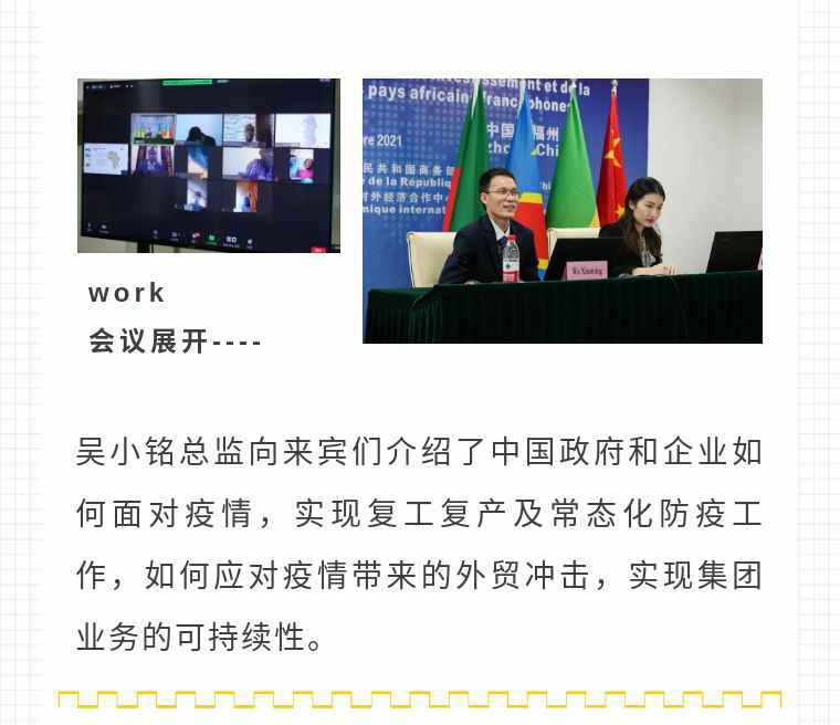 2021年9月6日,深圳贤宇健康饮食咨询有限公司应福建省对外经济合作中心邀请,由非洲大区市场总监吴小铭作为代表与包括25位来自非洲法语国家经贸、投资促进政府部门官员及企业管理人员就疫情下中国企业如何应对机遇与挑战展开讨论。